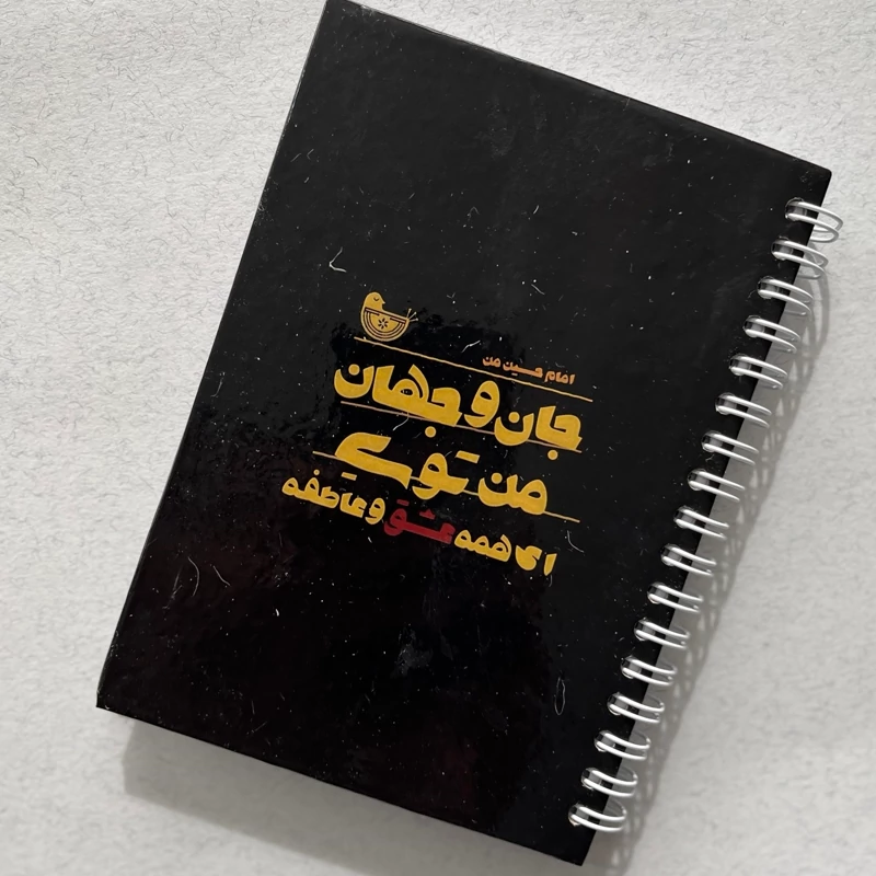 دفترچه مداحی با طرح جان و جهان من تویی ای همه عشق و عاطفه سایز 15*11 (A6) 60 برگ خط دار سفید ـ کاغذ 80 گرم صحافی جلد سخت فنری روکش سلفون