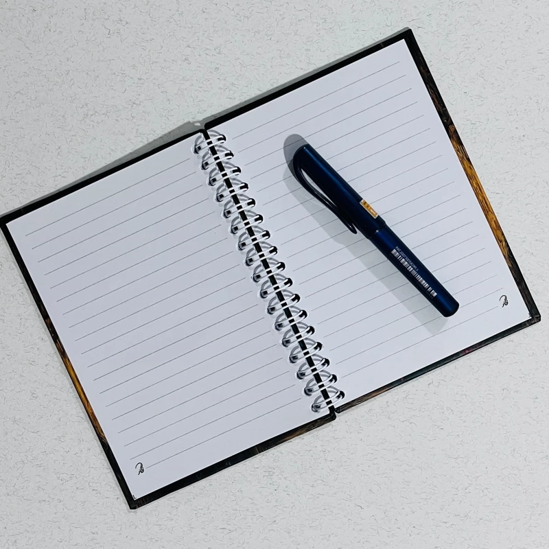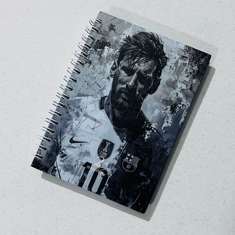 دفترچه طرح لیونل مسی برای طرفداران دوست داشتنیش تولید شده سایز 15*11 60 برگ خط دار سفید صحافی جلد سخت فنری روکش سلفون